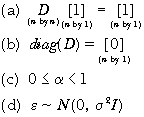 where D represents an n by n weighting matrix with 0s on the diagonal (the observation cannot predict itself) and non-negative off-diagonals. To maintain the interpretation of a weighted average, the rows of D sum to 1 as implied by below. Such weighting matrices are said to be row-standardized (Haining (1990, p. 82)). A non-zero entry in the jth column of the ith row indicates that the jth observation will be used to adjust the prediction of the ith observation (i ¹ j). After correcting for these interactions, the SAR models assume the residuals, e , are independently and normally distributed. These assumptions appear in .